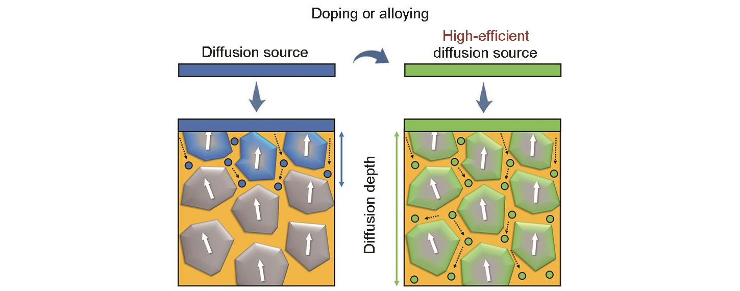 Anvendelse af denne teknik, som fordeler tunge sjældne jordarters grundstoffer med lavt indhold langs korngrænserne, forbedrer korngrænsedefekter og opnår en betydelig stigning i Hcj.